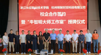 近日,学校与杭州明智时空科技有限公司在第二报告厅举行了校企合作签约暨“牛智明大师工作室”授牌仪式。杭州明智时空科技有限公司总经理牛智明、销售总监刘洋、技术总监汤先辉、机场方案部经理杨长炜、学校副校长冯新红、校企合作处处长吴少俊、智能技术学院院长张晓燕、党总支副书记余泓以及教师代表参加了此次活动。
