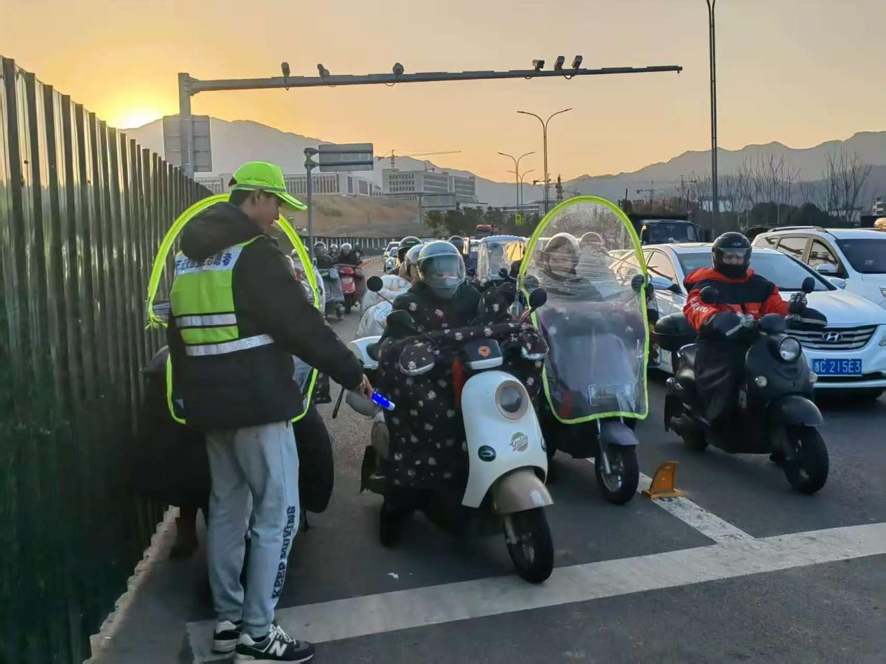 交通劝导一线,学子化身平安守护者。田肃明等同学对接当地交警部门,身着志愿服驻守辖区重点路口,在交警指导下引导行人和非机动车文明通行,耐心劝阻闯红灯、逆行等不文明行为,同时为群众提供道路指引服务。寒风中的坚守不仅提升了路口通行效率,更带动群众增强交通安全意识,学子们也在实践中锤炼了责任意识与沟通能力。