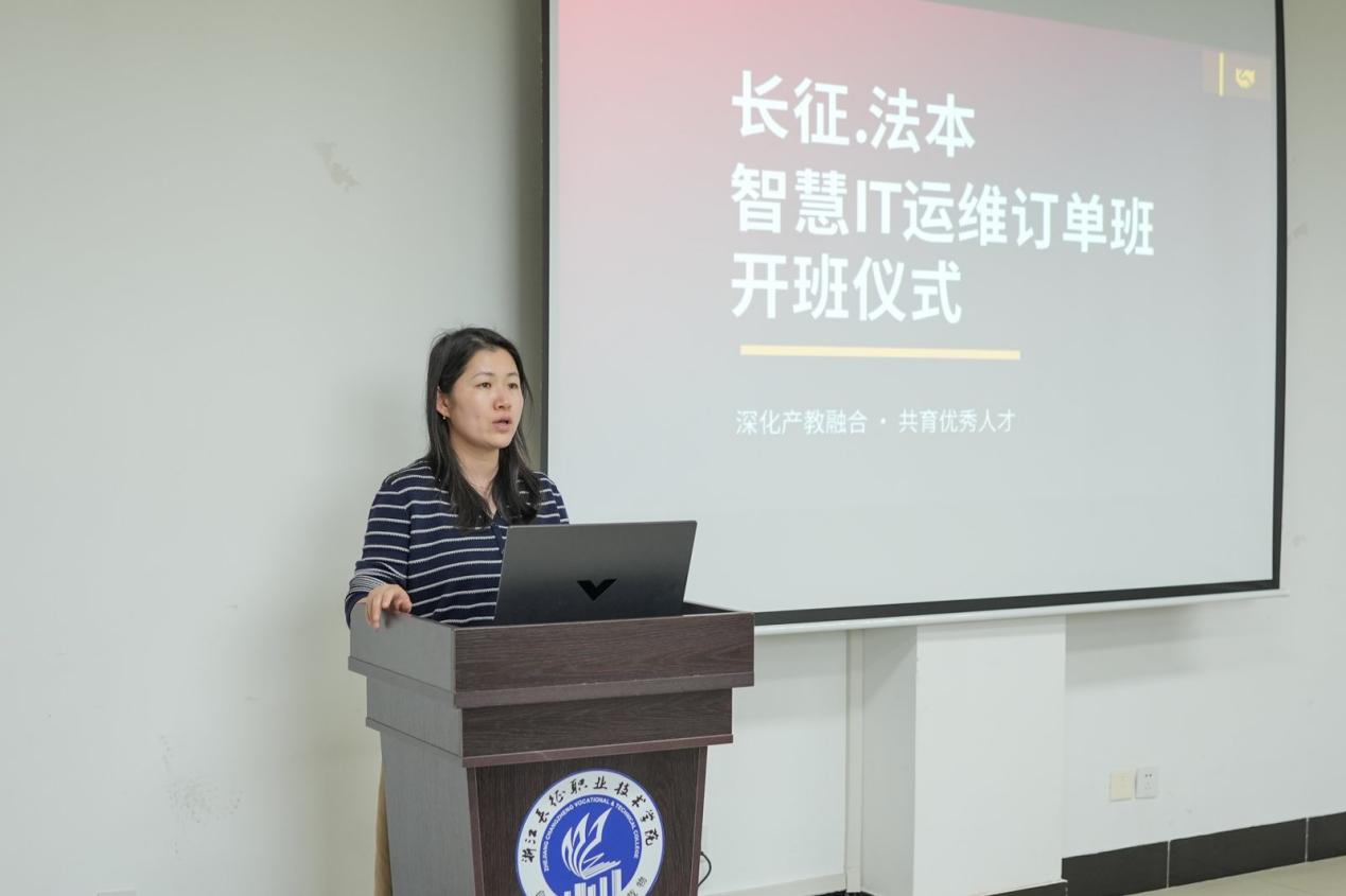 仪式上,徐静对企业的支持表示感谢。她勉励订单班全体学生,要珍惜此次机会,树立明确目标,刻苦专研专业知识,精进IT运维技能,以严谨的态度对待学习和实践,努力成长为符合行业需求的高素质技术技能人才。